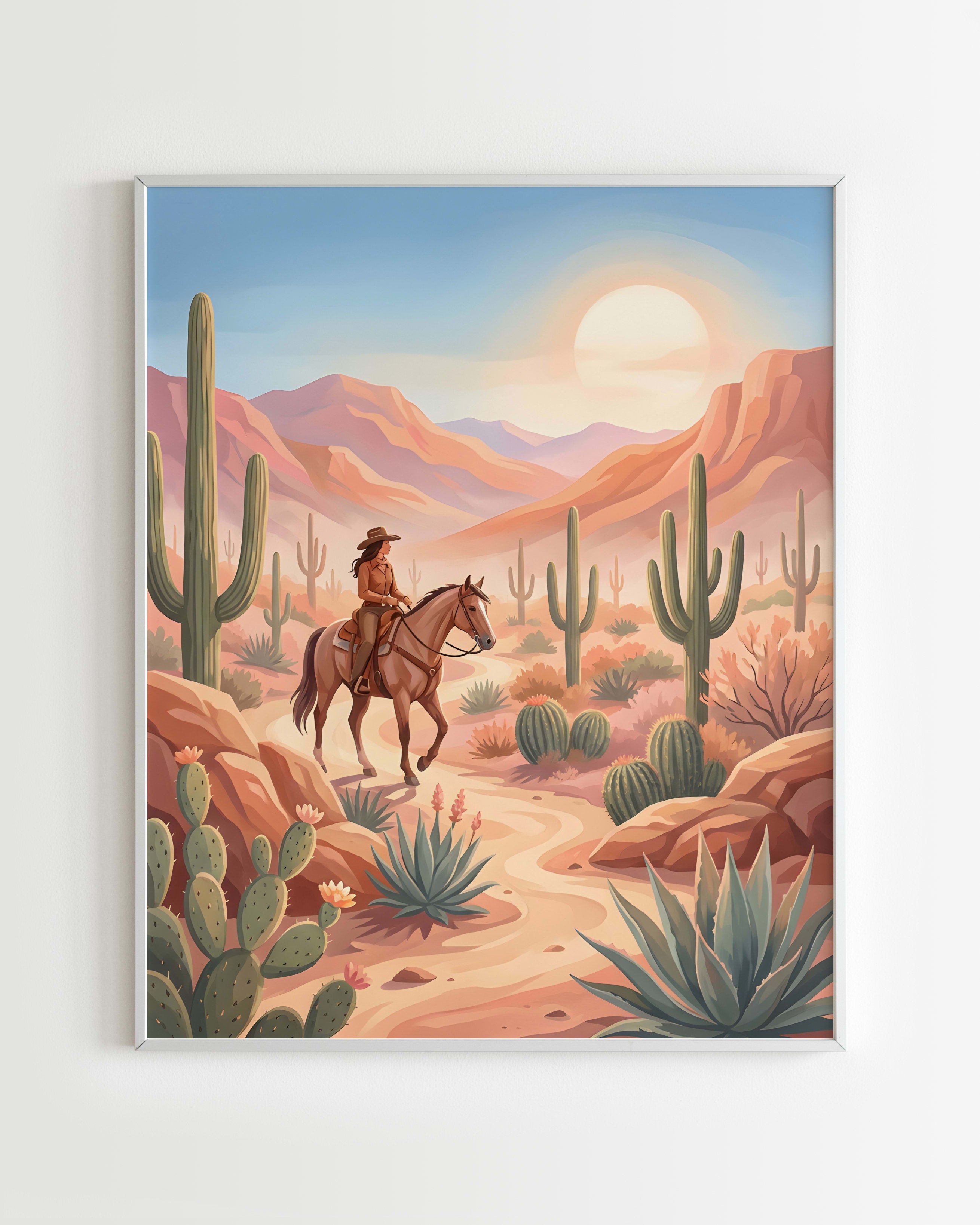 Cette œuvre incarne pleinement l'ambiance intemporelle et apaisante du désert occidental. Les teintes douces de rose, de terre cuite et de vert sauge se fondent harmonieusement, révélant une cavalière élégante traversant des étendues jalonnées de cactus majestueux et de montagnes ondulantes sous un soleil éclatant. La lumière baigne chaque détail, créant une composition sereine.