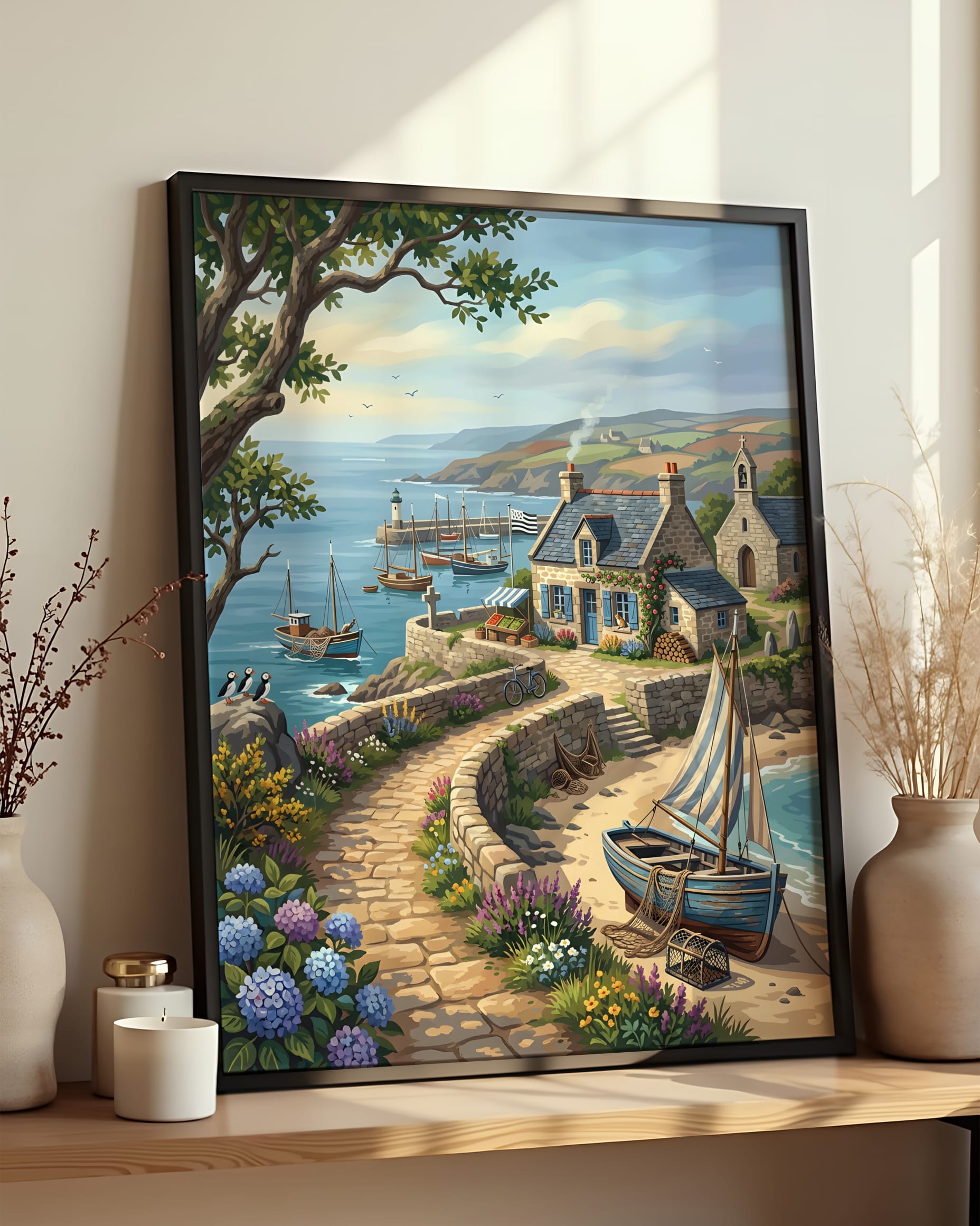 Cette oeuvre incarne pleinement l'ambiance sereine et authentique de la côte bretonne. Les toits d'ardoise des maisons de pierre se nichent au bord d'une mer d'un bleu profond, où flottent gracieusement des voiliers. Le sentier pavé, bordé d'hortensias et de lavandes, mène vers l'horizon lointain, sous un ciel paisible.